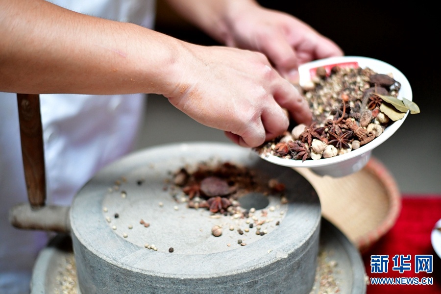 16日、河南省西華県逍遥鎮で、香辛料を石臼でひく[逍遥胡辣湯]継承者の高冬さん。