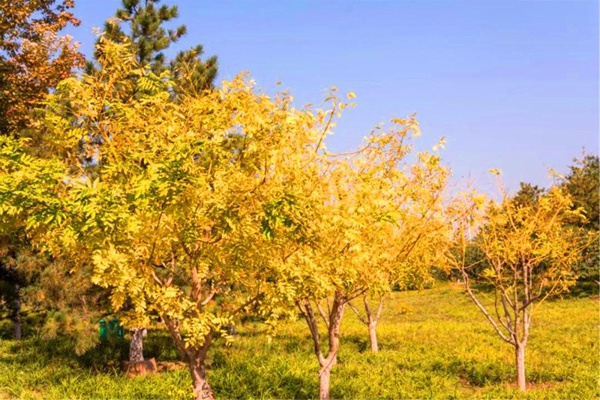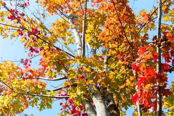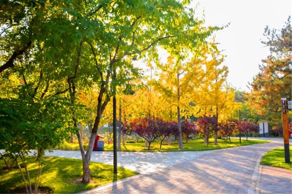 除了绿树中穿插的金黄色银杏外,还有不知名的红叶层层尽染在其中,放眼望去,绿、黄、红各色交织在一起,留下了副中心最美的秋韵。