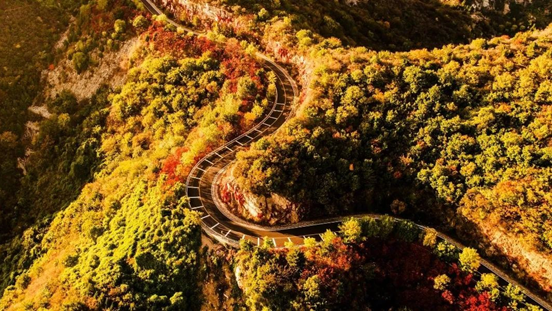 集泰山之雄、华山之险、黄山之奇、峨眉之秀于一体的云蒙山,有“北方小黄山”的美称。一叶知秋,云蒙山的彩叶变化从10月中旬开始。出游客中心后,便可沿着游步道体验静谧的秋色山路,感受7公里长的漫山秋色。最值得打卡的地方当属云蒙山索道,长度2534.9米,爬升高度620米,单程最快运行速度8分02秒,搭乘索道而上,如漫步云端,山中好景尽收眼底。云蒙山景区还有“海拔520米的520爱情之峰”、“海拔1314米的1314之巅”,在如此火热的秋天,年轻的男女来此赏红叶,更增添了一分浪漫和痴情。