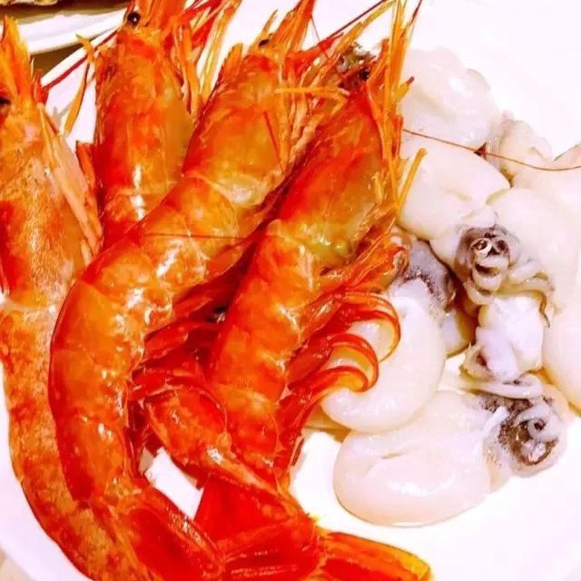 活着的海鲜类都非常新鲜,螃蟹是看着它挣扎着变红的,贝类看着它在锅里开口。大虾比手机还长,各种贝壳类鲍鱼、生蚝、螃蟹、基围虾,都是活的新鲜的,直接拿来丢火锅里就煮了。
