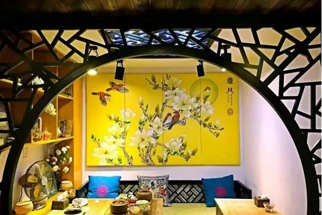 古色古香,非常有韵味的一家店,很有典雅古典的气息,从木质屏风的结构到墙壁上精美的刺绣壁画,最后到轻纱缭绕的垂地纱幔,无一处不精致,无一处不典雅,深得古风热爱者的喜欢了。