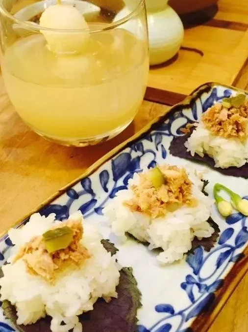 紫苏的味道十分的清香,饭团上的洒满金枪鱼肉和酸黄瓜,吃起来有种寿司的口感,格外的清爽怡口,造型也特意弄成花瓣的模样,很有心了。