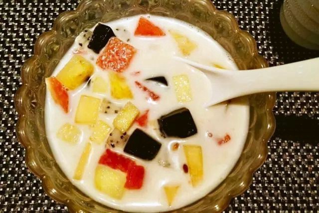 椰浆西米水果捞,里面的水果很新鲜分量也很足,冰冰凉喝起来很爽口~