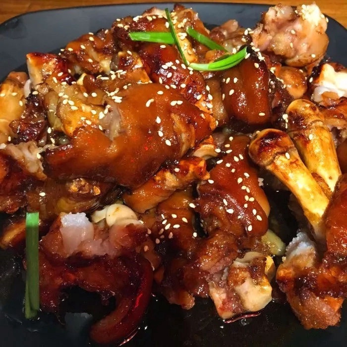 除了炖的猪蹄锅以外,还有烤的外焦里糯的烤猪蹄,再撒上孜然辣椒面~因为提前炖过了,吃起来真的是软烂脱骨啊!!