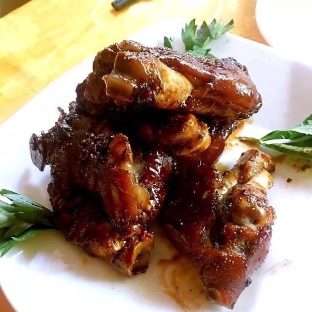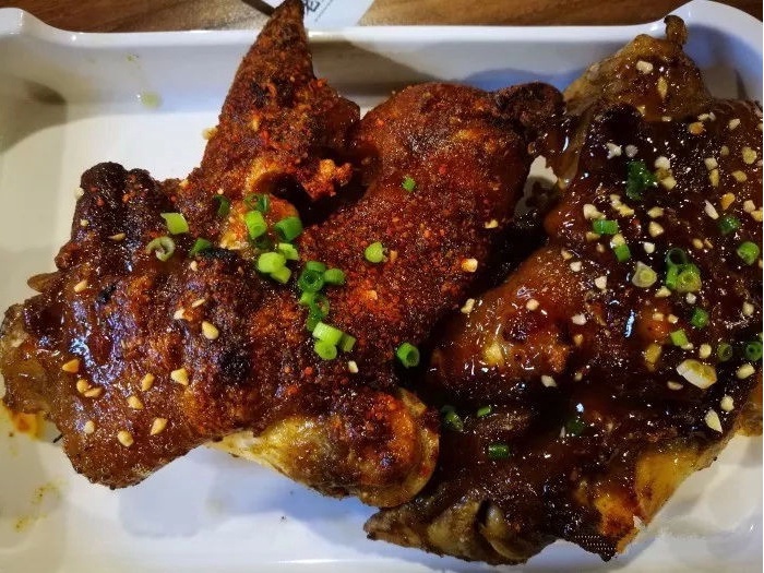 据说他家的猪蹄,是用30多种香料腌制,再用老汤卤到猪蹄香酥软烂,最后再用炭火烤制而成的。