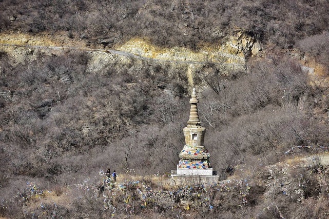 笔者对第二种说法较有兴趣,遂去谷积山寻访。史料中此山有名的古刹有环秀禅寺、广智禅寺、高桥寺、灵鹫禅寺,另有三座古塔:铃铛塔、鞭塔、舍利塔。寻访的起点是吕峪沟,从这里进山,沿着新修的硬化山路迂回步行,只十分钟不到便可抵达以六字真言与金刚杵石刻闻名的环秀禅寺。