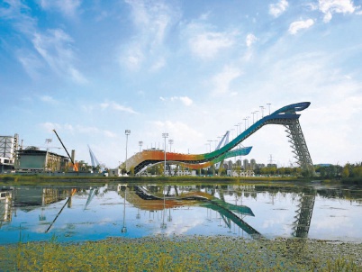 绕过三高炉,上了群明湖大街,望着蓝天掩映下的石景山,一路往南就能看到群明湖了。当然,也可以在路边扫个码,叫一辆无人驾驶的汽车,体验一番高科技的代步乐趣。站在碧波荡漾的群明湖东岸,岸边修建了长廊、牌楼和拱桥,远眺对岸,高高耸立的四座冷却塔、冬奥滑雪大跳台、新首钢大桥的合力之门与郁郁葱葱的石景山遥相呼应,古典的或是现代的,工业的或是自然的,过去的或是未来的,这些景观虽风格迥异,却并无违和,相得益彰。这里是最佳视角,可以充分领略首钢园所架构的“山、水、工业遗存”特色景观体系。2017年8月,国际奥委会主席巴赫来首钢园参观后,赞不绝口:“北京将曾经的一个钢铁厂改建成为冬奥会训练场馆,非常不可思议。他们在那里将旧厂房改造成办公室、休闲区、训练场,也成为北京冬奥会组委会的办公地点。我希望如果大家有时间,一定要去北京看看。”