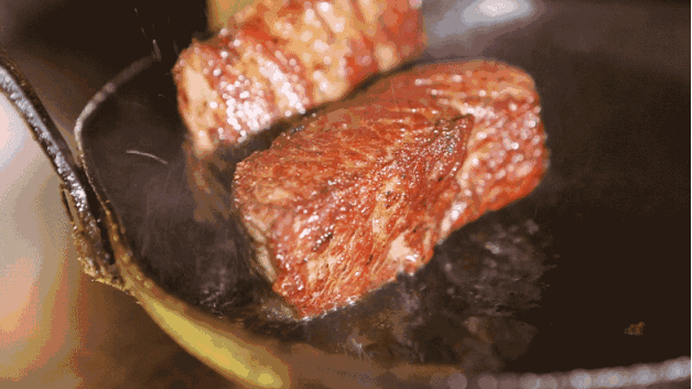 500多度的高温炙烤20—30分钟,烤制时大块油脂逐渐融化,让牛肉更软嫩多汁,烤熟的牛排会有超级浓郁的牛油香气,而瞬间的高温使汁水被瞬间锁定不外流。