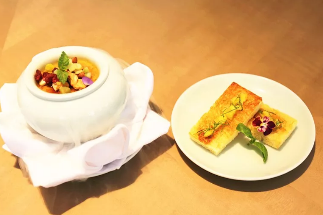 奶香南瓜汤配澳带,一块小南瓜瓤顶着半个带子上桌,服务员会帮忙把温热的南瓜汤浇在上面,橙黄色的南瓜汤,从视觉上就很有食欲,浓郁的南瓜和奶香更是扑面而来,味道醇正浓郁,带子也是肉嫩嫩的,青豆汤配帕尔玛芝士泡沫腌制红菜头,这道汤是分两份端上来,帕尔玛芝士泡沫放在碗中,选用进口新西兰甜豆,煮熟后磨碎入汤,汤色清润如玉,帕尔玛芝士打出绵密泡沫,执起壶身,一汪碧绿的汤水倾泻而下,瞬间淹没了雪白的芝士,搅拌后抿一口,芝士的醇香混合青豆,绿色和白色的组合清香扑鼻,爽口提神。