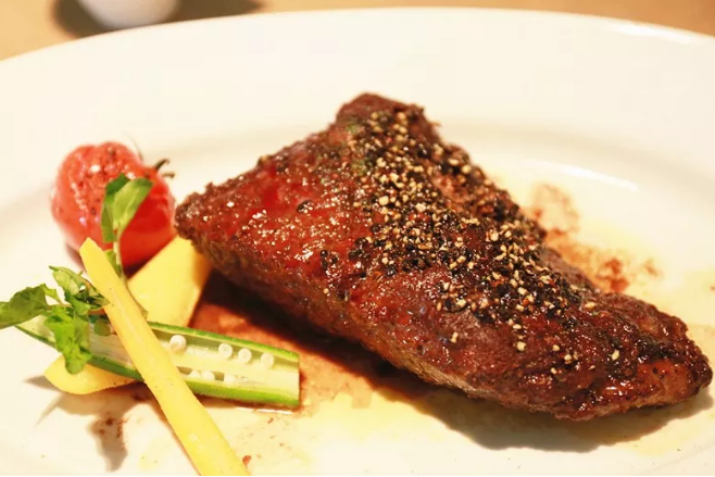 100度的盘子,保持了出炉后牛排的温度和口感,为提高牛排的香度,底部还抹了一层黄油,上桌时,还在滋滋作响,再浇上浓郁黑椒汁,更加诱人。