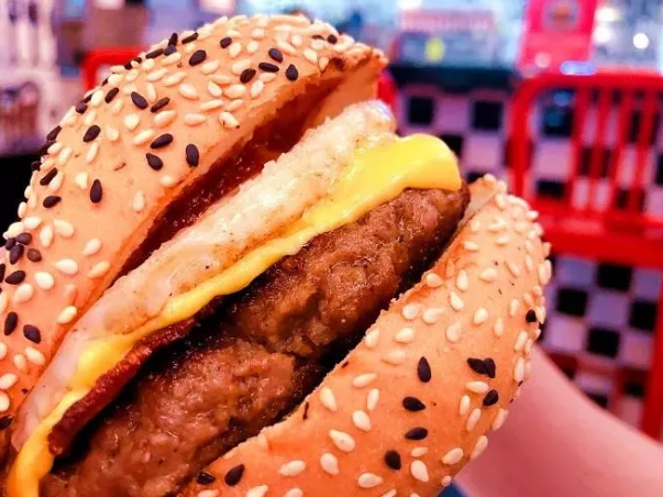威姆派汉堡大汉堡的个头真是名不虚传,绝对一个大碗的大小。面饼松软微甜,洒满了清香的黑白芝麻,一咬撕皮掉渣的感觉超级棒。最重要的是里面的馅料,软嫩的牛排肉弹牙香口,煎的弹嫩流汁的鸡蛋配上微脆卷边的培根,一口脆香!