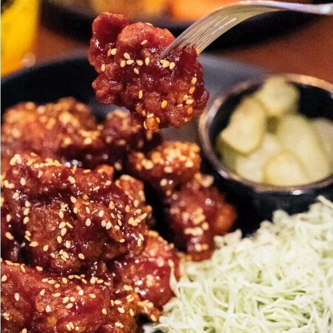 韩式甜酱炸鸡。这颜色一看就很有胃口。丰富浓郁的酱料,鸡肉不干不柴,非常嫩滑。炸鸡加啤酒,有种韩剧主角的感觉。