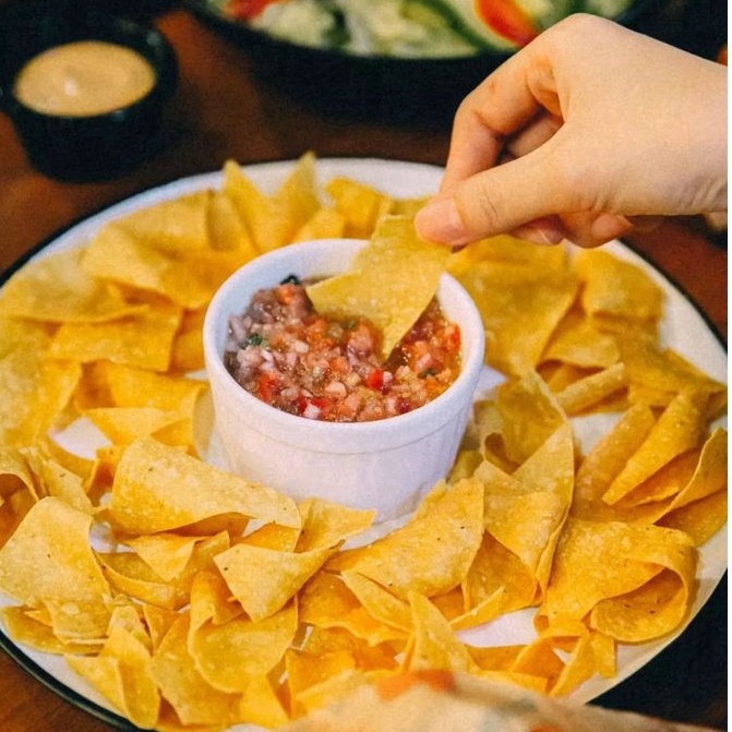 墨西哥玉米片。经典的开胃菜,由玉米做成,营养丰富。一口咬下去脆脆的,蘸上酱料十分爽口。