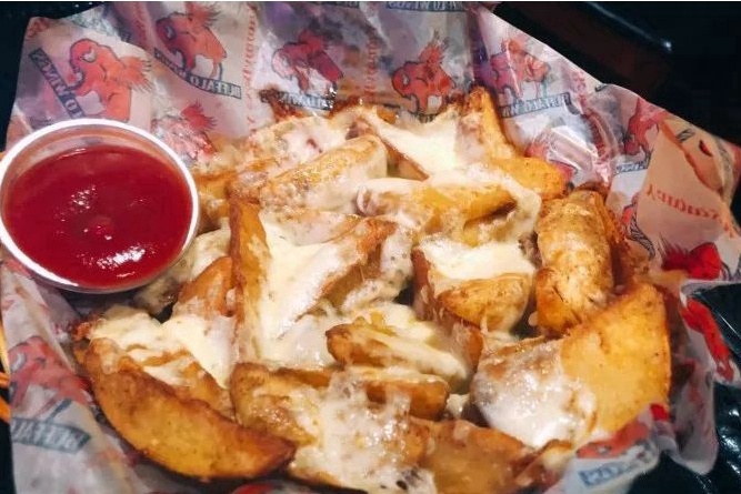 奶酪薯角。薯角上满满一层芝士,每一块都能拉丝。炸得金黄的薯角,外皮酥脆,内里绵软。香浓的芝士淋附其上,两者结合口感愈发的浓郁,一定要趁热吃哦~