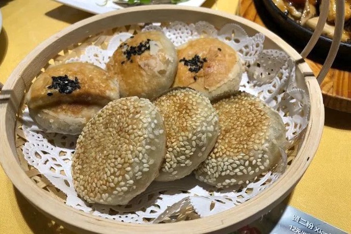 不二非肉饼,用菌类、胡萝卜调馅做成的芝麻烧饼,皮酥馅鲜,很有层次感。
