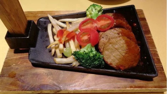铁板牛排,真的很逼真,仔细吃可以吃出豆腐味道。调料放得很多,肉味很浓。