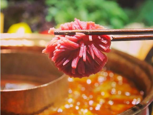 鸭胗打花刀切成盛开的菊花状,不仅好看,而且更挂汤汁。用筷子夹起一朵菊花放进红彤彤的辣锅里煮,看得人菊花一紧。久煮到透的鸭胗吸收了辣汤,吃着紧实又多汁。