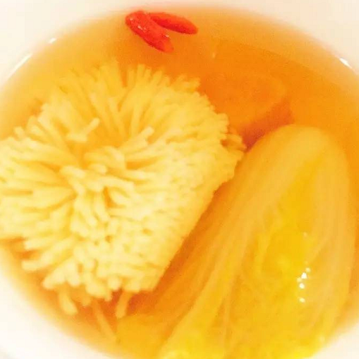 这是道汤菜。“菊花”配枸杞看着就养生。其实汤里的菊花是用日本豆腐做的,超级考验厨师刀工。汤的味道清淡而不寡淡,好喝。