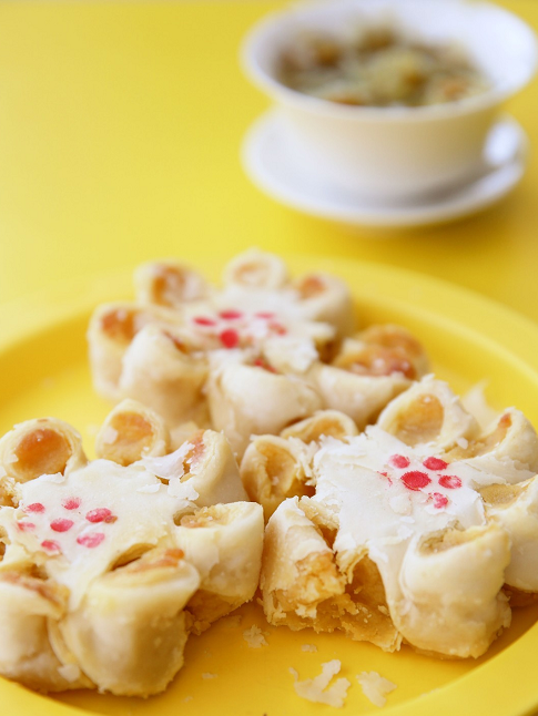 菊花造型的酥皮点心。用蜂蜜和蛋黄做的,里面没搁菊花。味道香甜不腻,有种中式点心特有的酥绵口感。搭配菊花茶食用,一菊两得。