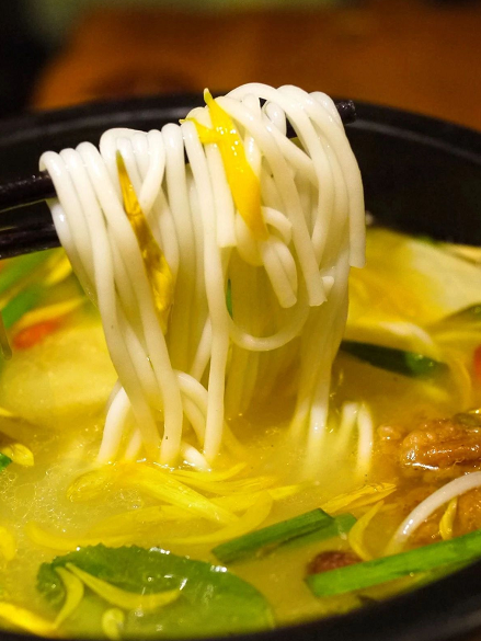 菊花米线里是真有菊花瓣。一大碗热鸡汤端上来,下米线的顺序有讲究。要先生后熟,先肉后菜。这样才能充分利用鸡汤的热度把所有食材烫熟。米线里菊花的量不少,能吃得出淡淡的菊花香气。
