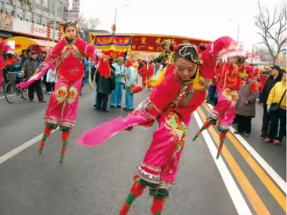 高跷秧歌有文武之分,文跷以走场、歌唱为主,武跷以武功见长。五斗斋的高跷原是文跷,有10 个角色。其走场讲究“扭、摆、悠、颤”,即腰左右扭,手前后摆,双膝顺势上下悠颤。不同人物各有特色,如武扇动作幅度大,上身大摇大摆,膝部大颠大颤;文扇羞怯忸怩,动作小扭小晃。歌唱则是京腔大韵,高亢婉转,韵味十足。唱词内容多为劝人行善或来自神话传说,如《白猿偷桃》《小五佛》《卖豆歌》等。后来为了增加观赏性,增加了渔婆和膏药先生两个角色,还增加武跷的惊险高难动作,如“鹞子翻身”“怀中抱月”等。