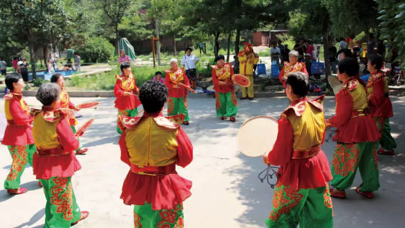 石景山太平鼓是一种以单面鼓为道具的民间舞蹈,可以自己击鼓点,边打边舞,也可打一段鼓唱一段曲,花样繁多,动作幽默,别具一格。