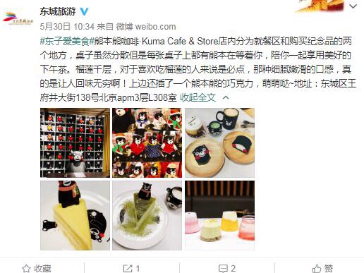 熊本熊咖啡·Kuma Cafe & Store店内分为就餐区和购买纪念品的两个地方,桌子虽然分散但是每张桌子上都有熊本在等着你,陪你一起享用美好的下午茶。榴莲千层,对于喜欢吃榴莲的人来说是必点,那种细腻嫩滑的口感,真的是让人回味无穷啊!上边还插了一个熊本熊的巧克力,萌萌哒~