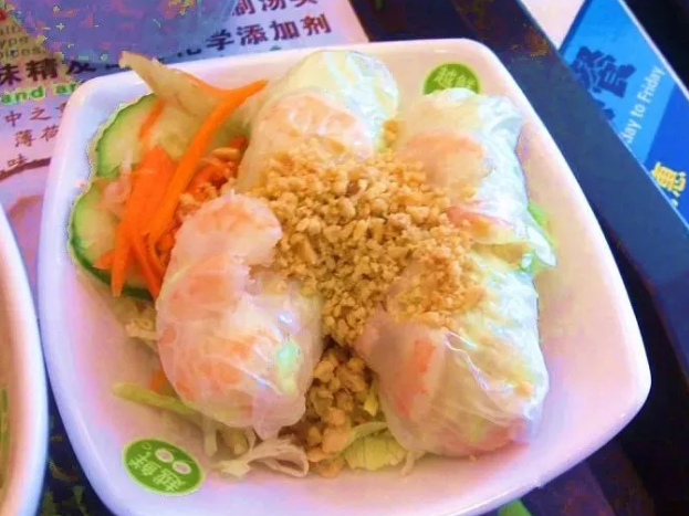除了春卷,绝对不要错过这个鲜虾米纸卷!真的是米纸一样,又韧又透,米皮口感微干,蘸上特制的调料汁之后,有种酸甜的口感,非常开胃。尤其是里面一整只的鲜虾,粉嫩非常,总想要一口吞下!一定要蘸满酱料,不然吃不出鲜香哦!