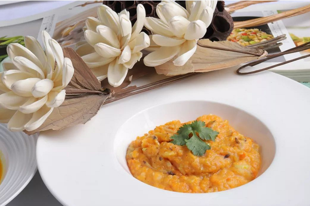 莲花蟹黄也是莲花空间的招牌菜之一,除了外表精美之外,这道菜的做法也十分有创意,这黄灿灿的“蟹黄”是由土豆和胡萝卜做成泥炒制而成的。