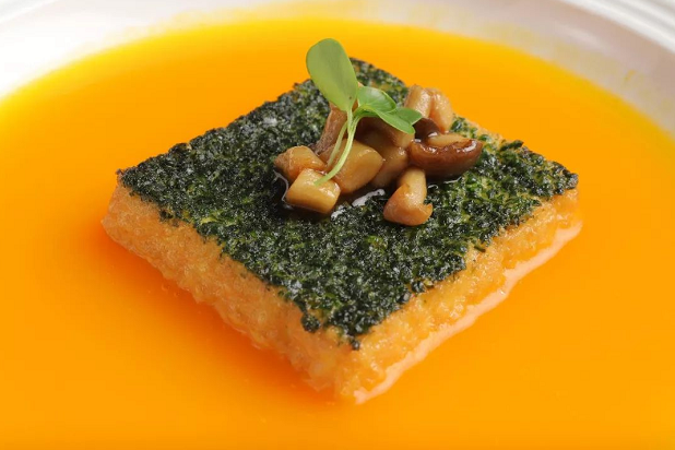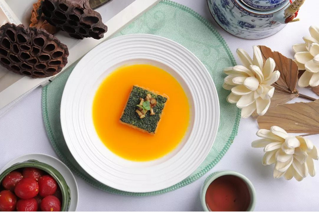 莲花空间的招牌菜金汤碧玉豆腐俘获了不少苛刻的美食家的心,曾在央视美食纪录片《舌尖上的中国》上斩获大奖。餐厅将精选的海南小金瓜悉心熬制成南瓜酱汁,汤里带有南瓜独特的香甜。金汤中央整齐摆放的四方豆腐是以优质豆浆和柴鸡蛋手工制作的,营养健康。豆腐上均匀铺满碧绿的菠菜碎屑,再缀以蟹味菇、白玉菇和香椿苗,色彩艳丽,营养均衡。