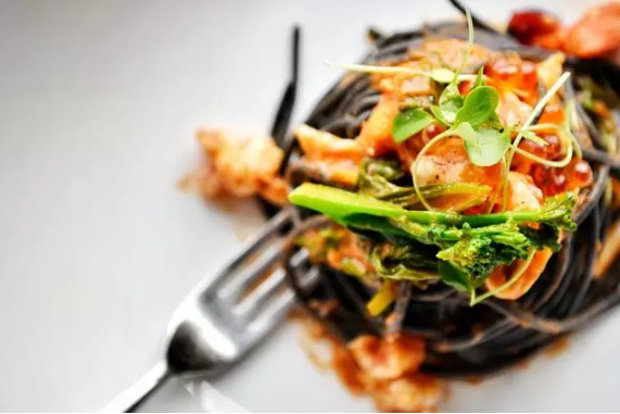 墨鱼意面,墨鱼汁和意面的搭配,被墨鱼汁染成了黑色的面条,海鲜的鲜甜和意面的口感混搭在一起,味道非常好。