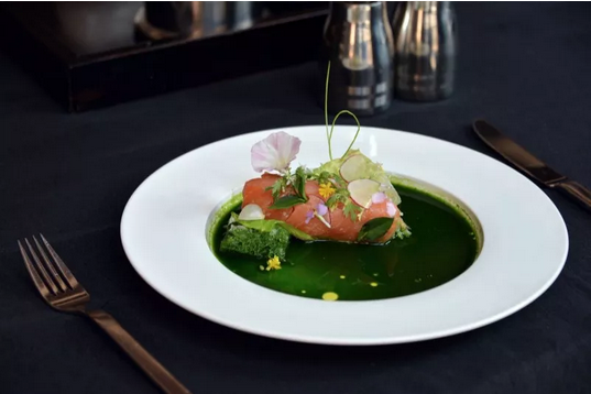头盘:果木烟熏三文鱼搭配蔬菜啫喱