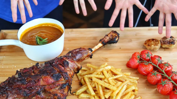 1米4长的巨型香肠,1公斤由2米高的大厨烹饪而成,除外还有比小臂粗的烤羊腿,独一无二的粉色汉堡,巨人大厨做的地中海菜,了解一下?