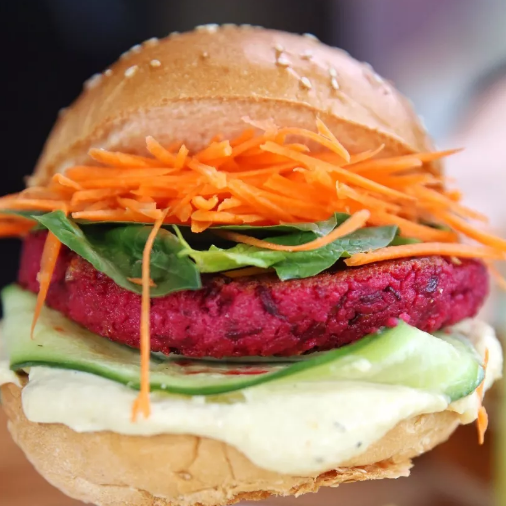 店里有一款很特别的奶油奶酪甜菜根汉堡,全素的搭配对素食者很友好。中间的粉色来自甜菜根,下面还有一层厚厚的鹰嘴豆泥。