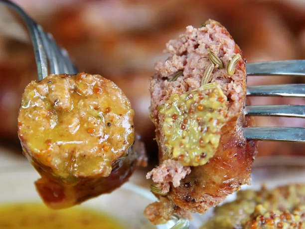 灌香肠的时候里面还加了迷迭香,口味比较独特。搭配黄芥末籽汁和酱一起食用,小编个人偏爱浓稠且酸味儿更显著的酱,很解腻呀~