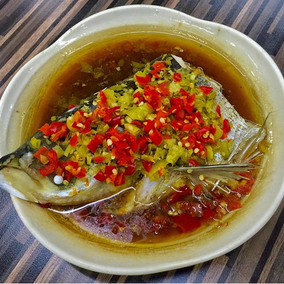 双椒鱼头的霸道来自于气势,硕大的盘子硕大的鱼头,一面是鲜艳的剁椒,一面是腌渍成黄绿的泡椒,铺满整个鱼头,看着就霸气十足。