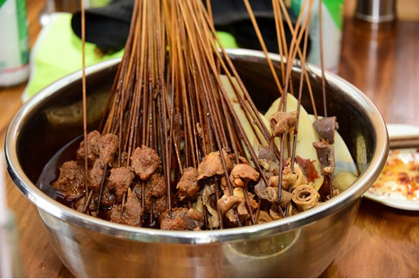 自制的米酒特别香,酒精度数4度,适合女生们喝。串串后再来斟酌一口,甜甜的,很解腻,再细看展示柜上的原创回文诗:“香闺吃串串成堆,吃串成堆酒意微。酒意微醺不识路,醺不识路入香闺。”别有一番情趣。