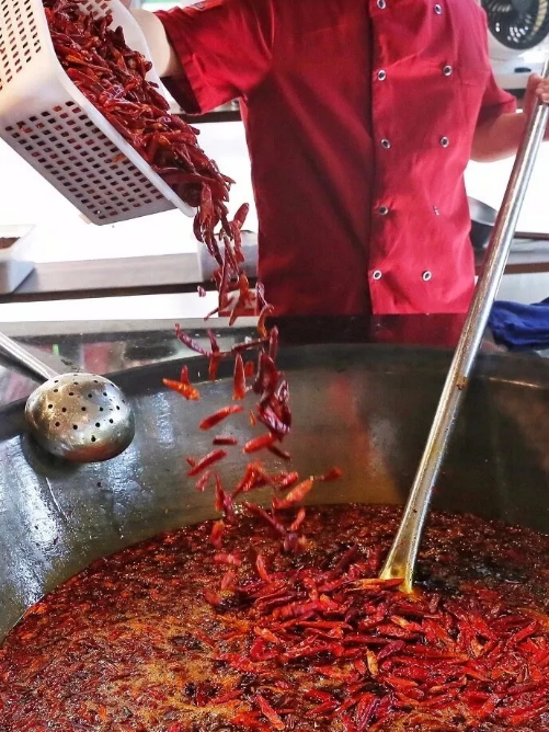 这两座辣山让无辣不欢的我看着蠢蠢欲动,都是从当地运来的辣椒,辣的地道。师傅炒料这场面看着实在太过瘾了!据说炒好一锅底料可以做出15份全红锅,要是鸳鸯锅的话差不多能20多份。