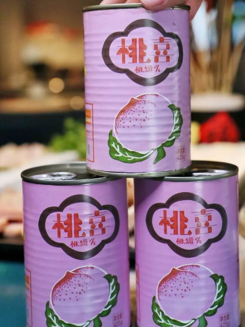 他家黄桃罐头造型很有年代感,是专门定制的复古风设计,像它的名字一样很讨(桃)喜(喜)呢。里面就是黄桃啦,吃完辣辣火锅再吃它,清爽解辣~