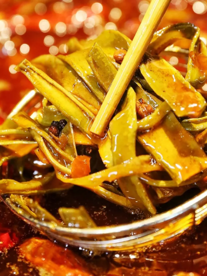 神仙草是他家很主打的菜,其实就是海带,超级薄都能透光了,营养价值高呀!来,我们吃个养生火锅~还有重庆特色菜香豆腐和干贡菜,都是大老远从当地赶来北京让你吃的哟。为了不让贡菜跑丢,可以用小漏勺涮哦,煮好之后一网打尽。