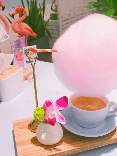 云朵咖啡,听到这个亦诗亦梦的名字,粉色棉花糖照射下的咖啡,有一种柔软的感觉,棉花糖柔软细腻,疏松多孔,具有一定的弹性和韧性,入口即化,不粘牙。由于甜度较低,适合休息时或者饭后食用。