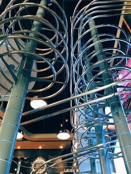 spacelab是一家起源于德国的特色餐厅,也是全球第8家,国内首家失重餐厅。一进店里就第一感觉是过山车餐厅,1000平米的空间里纵横交错的螺旋轨道遍布了整个店内,上菜的方式就是通过这些轨道的螺旋角度减缓速度,最终让餐品完好的“飞”到食客的面前。最有趣的是,站在餐厅的任何角落,都时不时的可以听见机器传菜的声音。