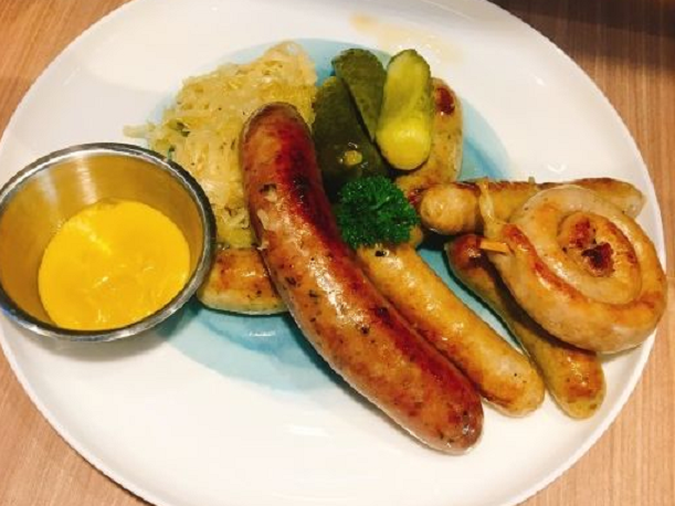 德国香肠,这个也是必点之一。香肠吃起来是脆脆的口感,配着蛋黄酱酸黄瓜、酸菜、烤西红柿,味道不错,香肠是外焦里嫩,吃起来非常有嚼劲,适当的搭配着酸菜一起吃,可以解除香肠的油腻。