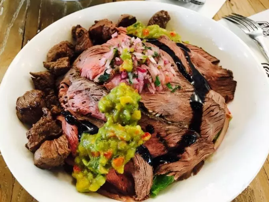 甜辣牛肉,吃的第一口就激动啦,基础酱汁应该是brown sauce,相对饱满一些味道较清淡 ,表面有大片撕成丝的牛肉,料足。下面有各种生菜、洋葱、鹰嘴豆、瓜子、番茄等等,虽然有大片肉但也非常小清新的一道菜,要是这盘菜能铺更多种类的绿叶蔬菜就更好了。