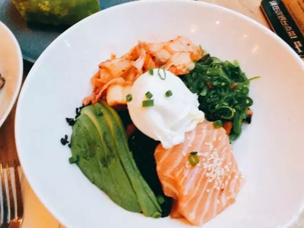 生三文鱼拌饭,这是每次去摩卡站必点的菜,里面的辣白菜和海带丝配上黑米饭的味道,让我感觉新奇又好吃、饱腹感很强又很健康~三文鱼、海藻、辣白菜也都是我喜爱的元素,里面的烤南瓜甜甜的,黑米有嚼劲,无油还健康,是一道创意的poke搭配,健康美味。