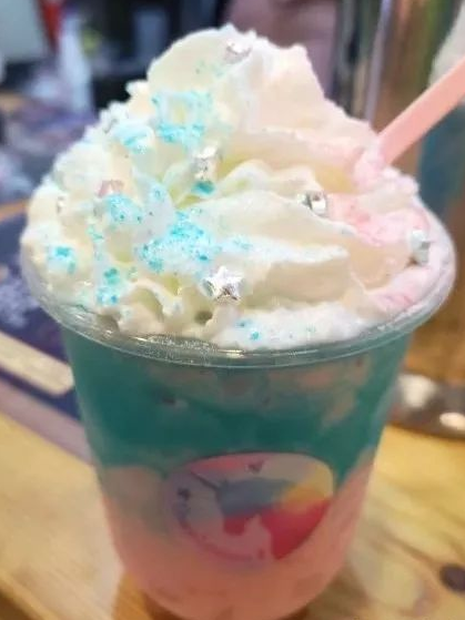 颜值高,味道也超级香甜的。最上面一层奶油,是那种软软的甜味,一点也不腻,粉色和蓝色的是白砂糖,非常漂亮,喝起来有种水果清甜的味道,推荐!