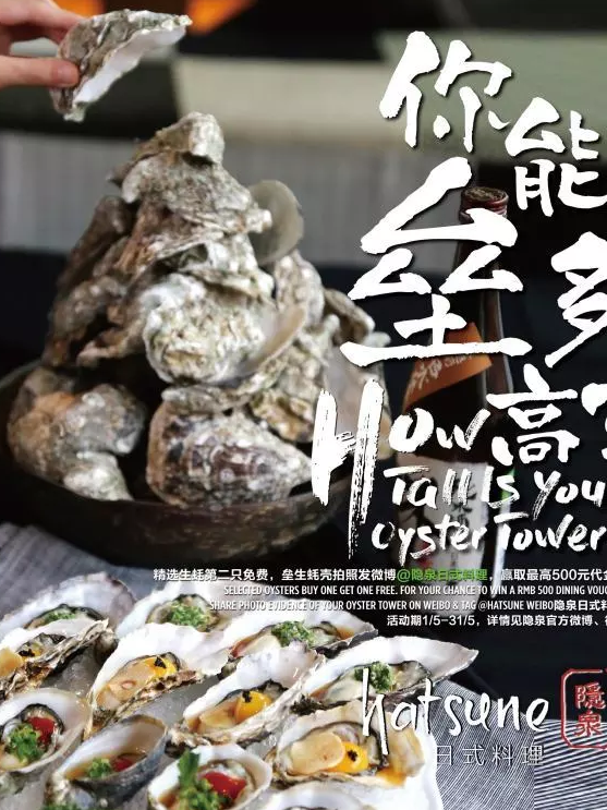 在隐泉堂食生蚝,还有惊喜挑战赛。在店内桌面将生蚝壳垒高,拍照分享微博,带上话题#大战生蚝#并@隐泉日式料理,隐泉将在5月31日活动结束后,抽取10名蚝客各赠200元代金券。