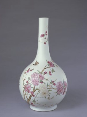 瓶直口,长颈,圆腹,圈足外撇。通体白釉,粉彩装饰。外壁绘桃树一株,蔓遍器身,花蕾欲放,鲜花婀娜,绿叶青翠,彩蝶飞舞其间。胭脂红彩描绘的花朵颜色深浅不同,花心部分色料最厚,从花心到花瓣边沿红色渐趋浅淡。圈足内施白釉。外底署青花楷书“大清雍正年制” 双行六字款,外围青花双线圈。