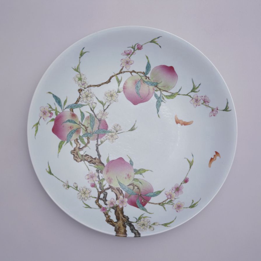 此盘形体硕大,造型端庄,纹饰主题寓意“洪福齐天”、“福寿双全”。这种从器内延伸至器外的画面俗称“过枝花”。清末寂园叟撰《陶雅》曰:“庚子后,所出五彩过枝之盘碗甚多,有桃实八枚缀于枝上者,索价亦甚巨。过枝云者,自此面以达于彼面。枝干相连,花叶相属之谓,皆雍正官窑也。”此种画法起源于清康熙时期,一直影响及道光时期,亦见有“过墙龙”、“过墙凤”等。晚清以后这种画法不多见。