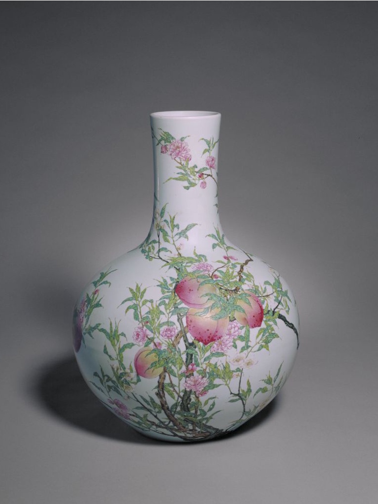 天球瓶以形似天体星球而得名,此种器形始见于明代永乐、宣德时期,流行于清代雍正、乾隆两朝,属于陈设用瓷。后世所制粉彩蟠桃纹天球瓶多以雍、乾时期的制品为蓝本烧造而成。雍正官窑粉彩瓷器上所绘蟠桃多绘八只桃实,而乾隆时则多绘九只桃实,因此有“雍八乾九”之说。此瓶彩绘构图疏朗有致,釉色浓淡相间,绘画精细工巧,堪称雍正官窑粉彩瓷器的代表作。